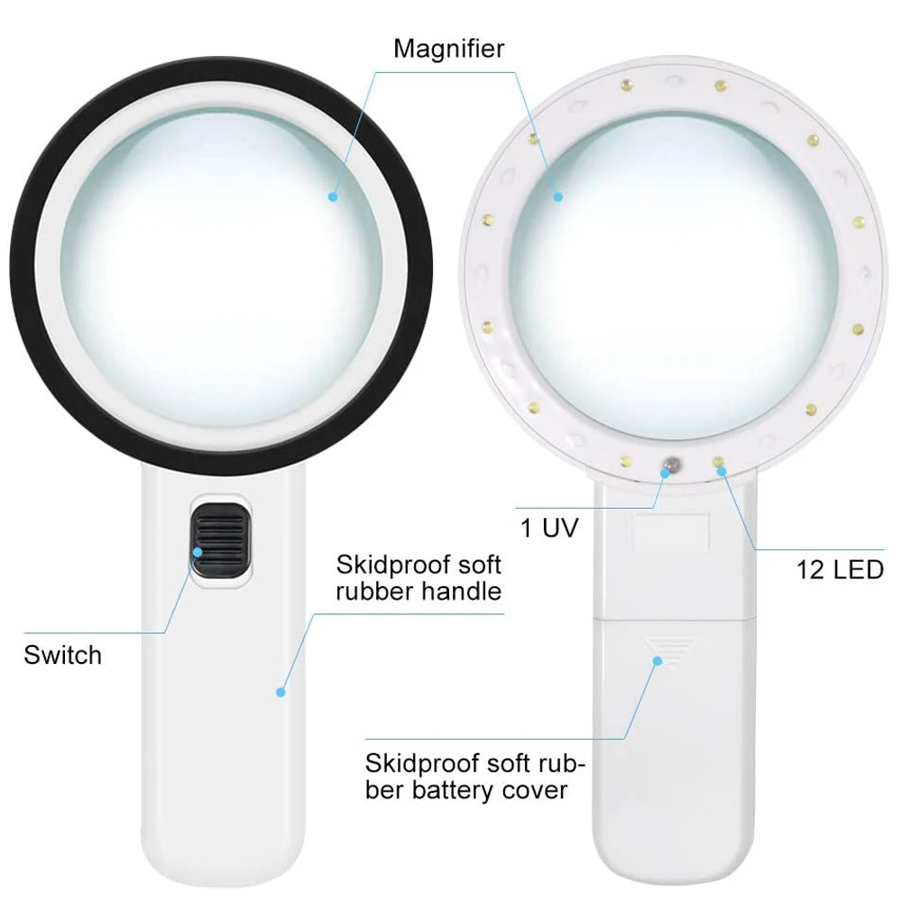 This handheld 30X magnifying glass features a ring of built-in LED lights, offering enhanced brightness and clarity. Whether you're reading a medication label, inspecting a photo, or working on a hobby, this easy-to-hold magnifier is designed with comfort and simplicity in mind.